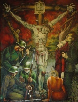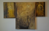 Die drei Bilder sind von unterschiedlicher Größe. Aus den erdigen, warmen Farben heben sich nach und nach Gestalten ab, undeutlich und schemenhaft zu erkennen. Ist es Jakob auf der rechten, kleinsten Tafel, mit der Himmelsleiter an seiner Seite? Dann könnte auf der linken Tafel vielleicht Abraham zu erkennen sein, den Gott berufen hat, sich auf den Weg zu machen aus seiner Heimat in ein Land, das ER ihm zeigen wird. Im Zentrum des Triptychons, aus der Tiefe, dem Hintergrund, der hellen Fläche der Tafel scheint sich eine Gestalt langsam zu erheben. Sie wendet uns den Rücken zu, bald wird sie aufrecht stehen. Ist es Adam, der erste Mensch?