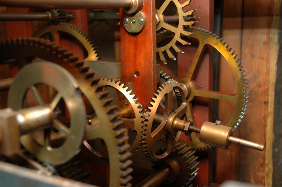Im Turm, unterhalb der Glocken, arbeitet das mechanische Uhrwerk noch in seinem Originalzustand von 1906. Damit gehört es zu den ganz seltenen noch funktionsfähigen Exemplaren seiner Art.